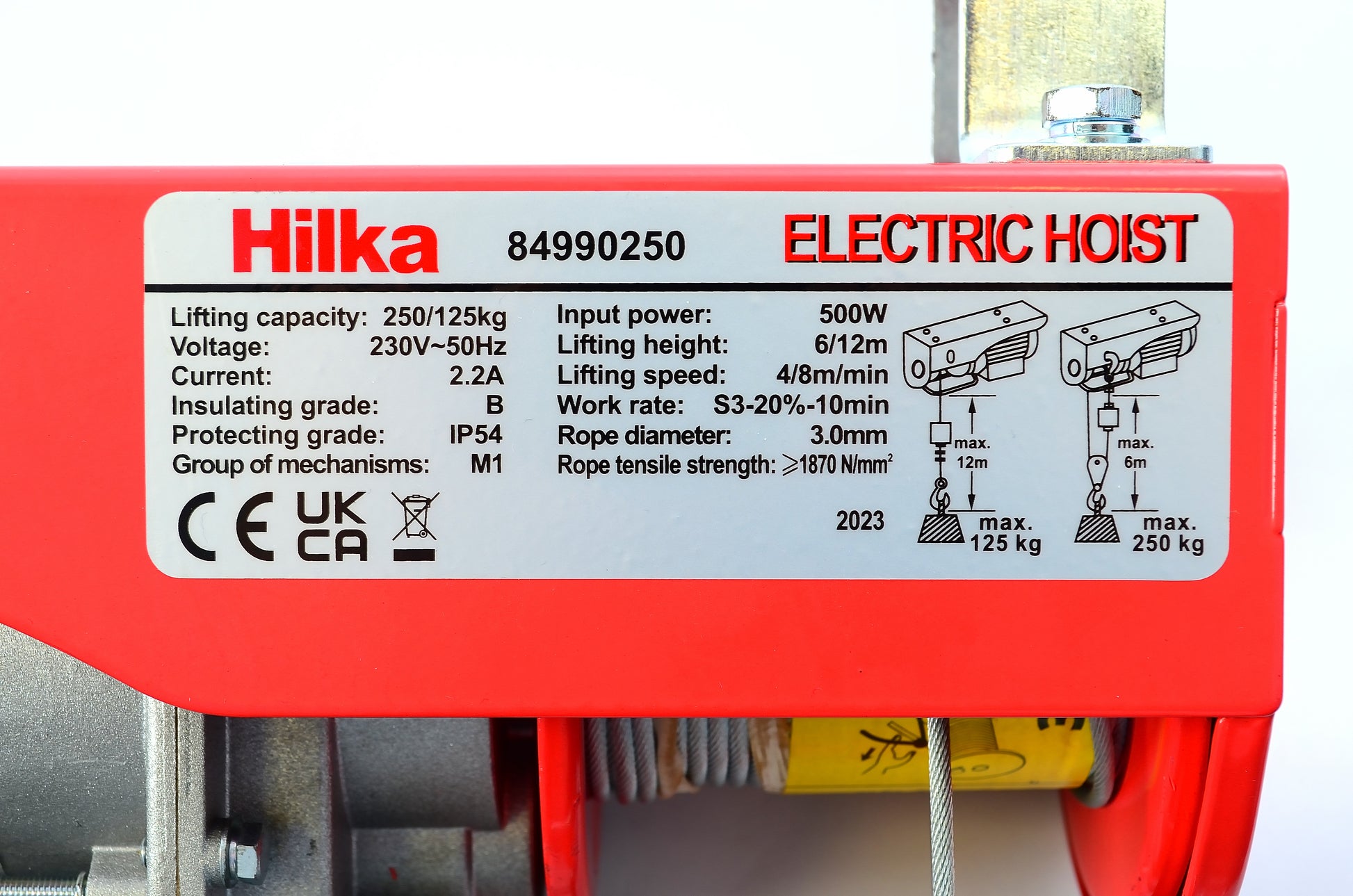 The 250kg Electric Hoist is designed for safe and efficient lifting in workshops, job sites, barns, and home settings. Supplied with support brackets, a pulley, and a remote lifting control, it offers flexible lifting capacities—125kg without the pulley and 250kg with. Featuring a lifting height of 12m (without pulley) or 6m (with pulley), it’s ideal for a wide range of lifting applications. An emergency stop button is built into the control switch for added safety, and the IP54 rating ensures it can be used outdoors (not in rain).