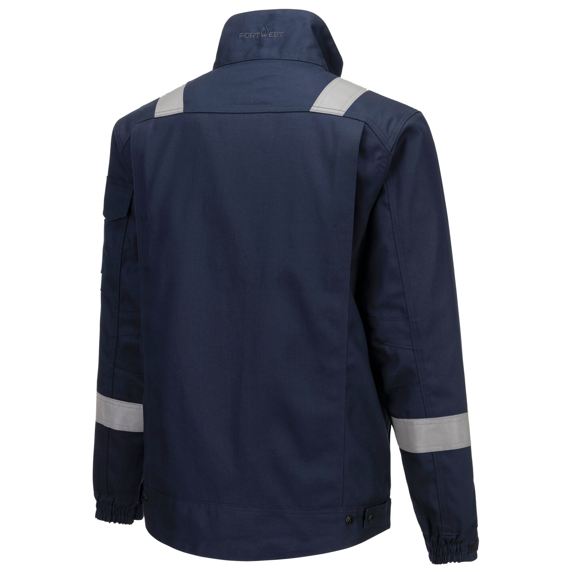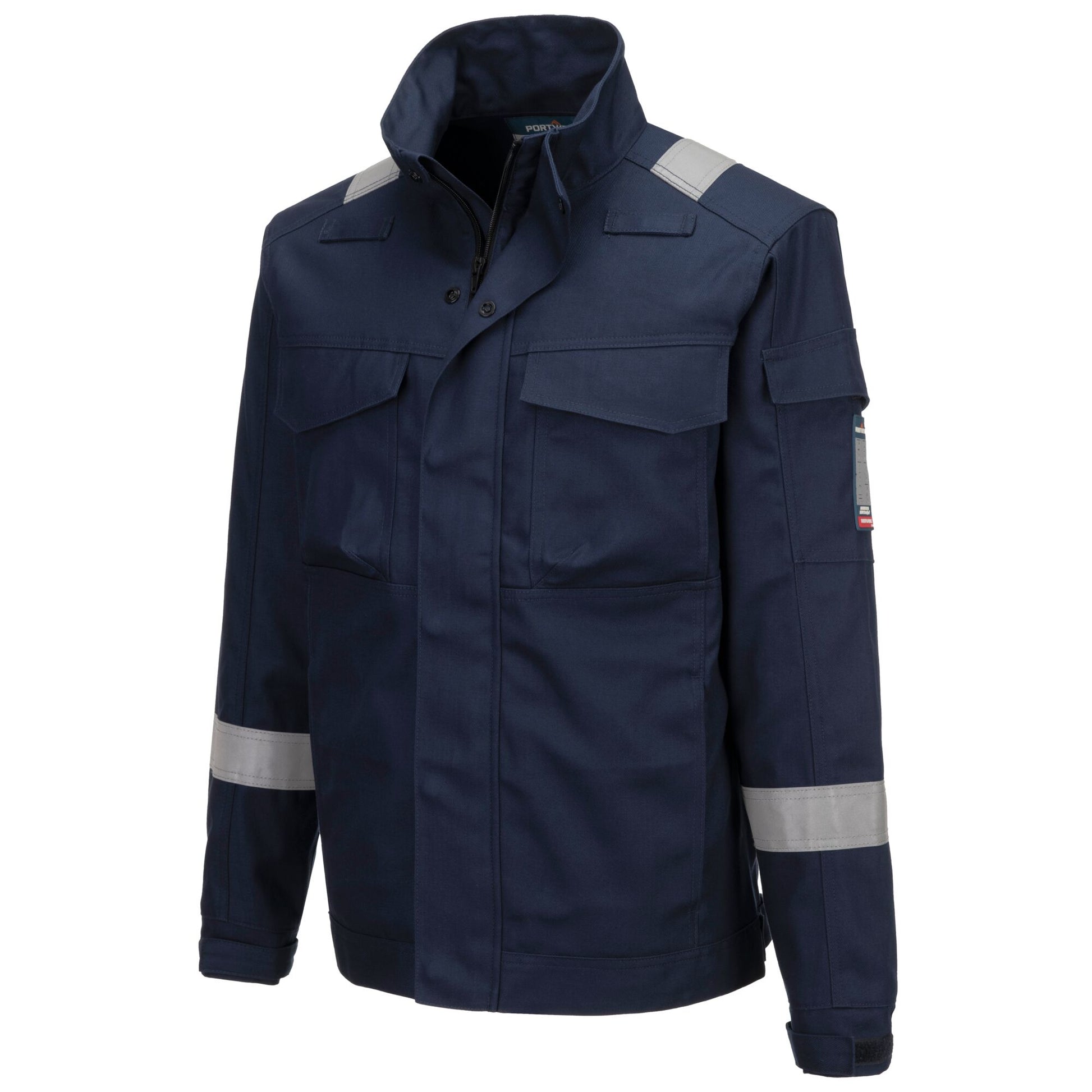 The FR68 Bizflame Industry FR Jacket is designed for off-shore and on-site work, providing maximum protection against multiple hazards. Crafted from a durable FR polyester blend, this jacket resists radiant, convective, and contact heat while remaining suitable for ATEX environments. Key features include hook-and-loop cuffs, five storage pockets, flame resistant industrial wash tape, radio loops, and certified protection against molten metal splash. Industrial washable and CE-CAT III certified, it combines safety, comfort, and durability for demanding workplaces.